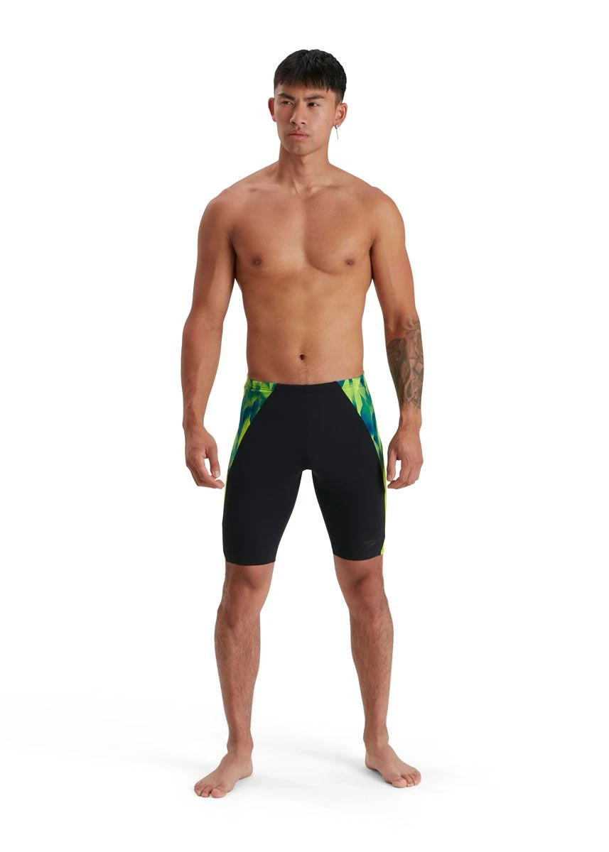 Tech inspired aesthetics. Cut a streamlined silhouette in training wearing with the black Spliced Jammer, designed with a two-tone side panel and colourful geometric print. Integral support and a modesty panel ensure you feel comfortable and supported during training, while the drawstring waist allows for an adjustable fit. Designed to be durable and better for the environment, it’s made from our new ECO Endurance+ fabric which is 100% chlorine resistant, quick-drying and made from 50% recycled materials.